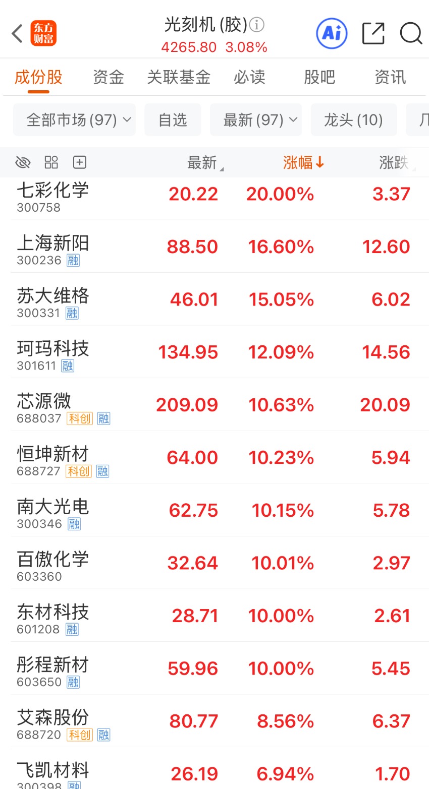 个股中,截至收盘,七彩化学、蓝箭电子“20CM”涨停,三佳科技、百傲化学、东材科技、彤程新材等“10CM”涨停,上海新阳、苏大维格、芯源微等股涨超10%,飞凯材料、雅克科技、晶瑞电材等多股跟涨。
