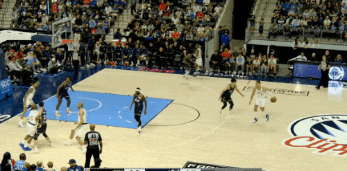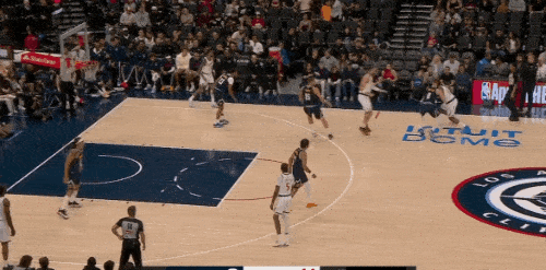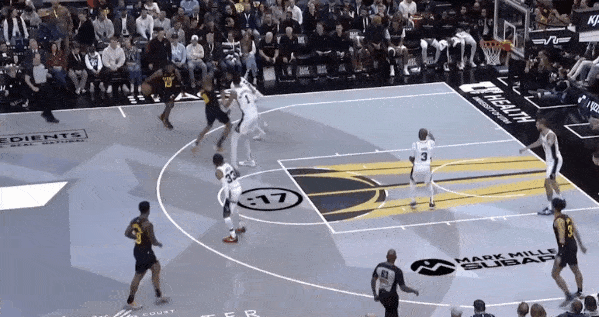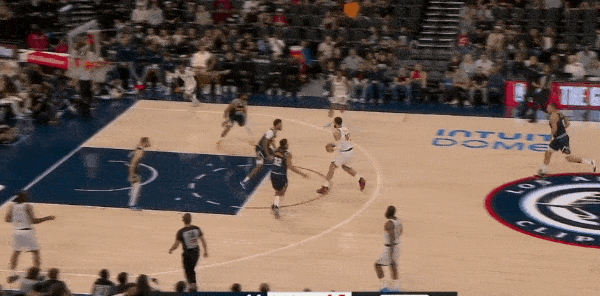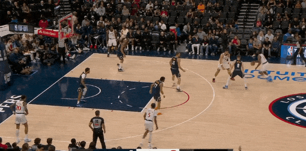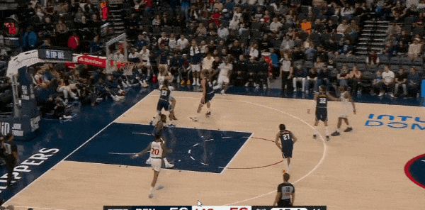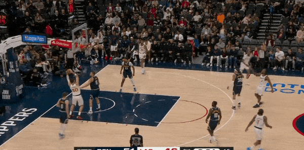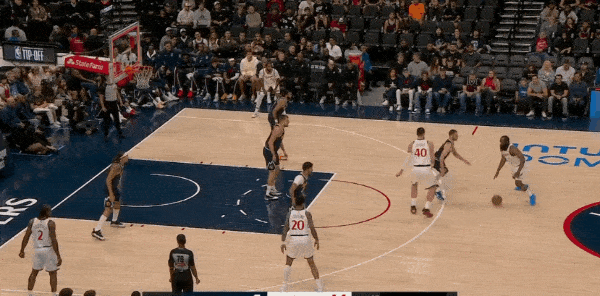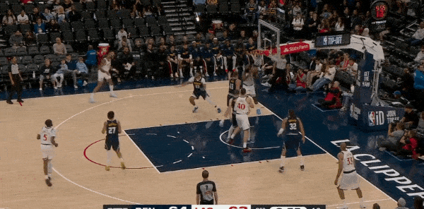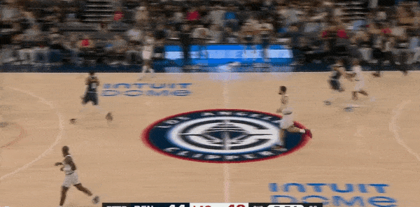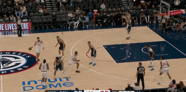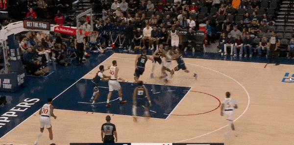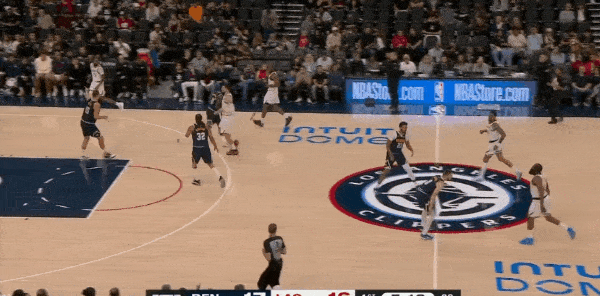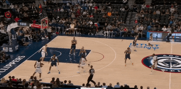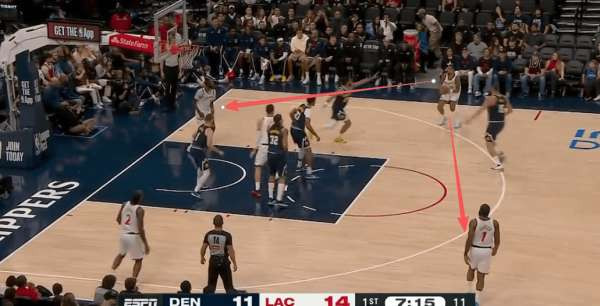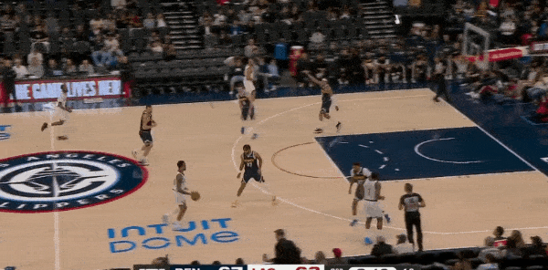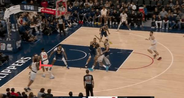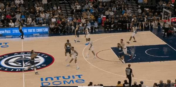比如本场开局快船的第一个进攻回合,琼斯持球过半场立即抓“早期进攻”(Early Offense)阶段与科林斯发动手递手配合。科林斯要到换防后,抓穆雷换防不及时的间隙出手以及持球中距离。