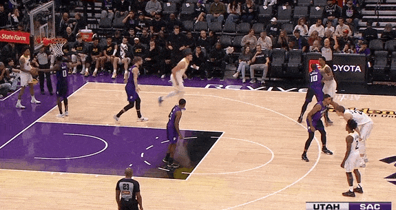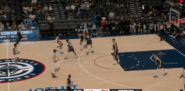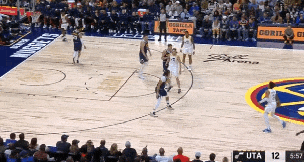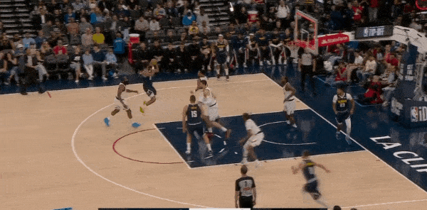 值得一提的是,这种“UCLA Cut”、“Hawk Cut”(鹰式切入)衔接后续边路挡拆的配合,也是掘金的常用战术,比如他们会让穆雷、约基奇、布劳恩三人进行这样的配合。
