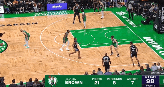 可是这球布朗并没有给科林斯留一丝下球空间,导致在开头科林斯放弃了转面框下球进攻的念头。换回背身对抗又没能抗动布朗,于是选择向惯用手侧转身衔接面框跳投,短。