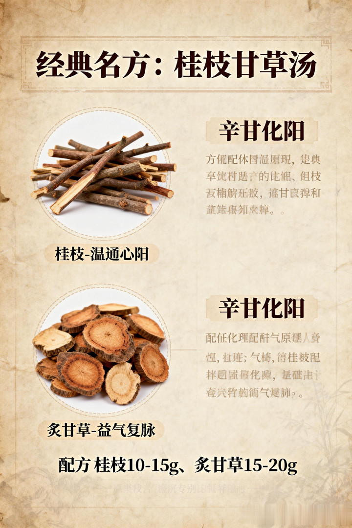 桂枝甘草汤出自《伤寒论》,是张仲景为心阳不足的患者量身定制的方剂。这个方剂只有两味药:桂枝和炙甘草。