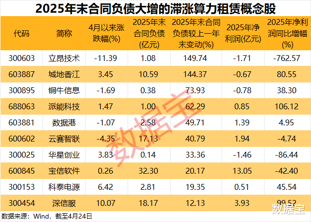 结合市场表现进一步来看,4月以来累计涨幅低于11%,且2025年末合同负债较上一年末增幅不低于10%的算力租赁概念股仅10只。